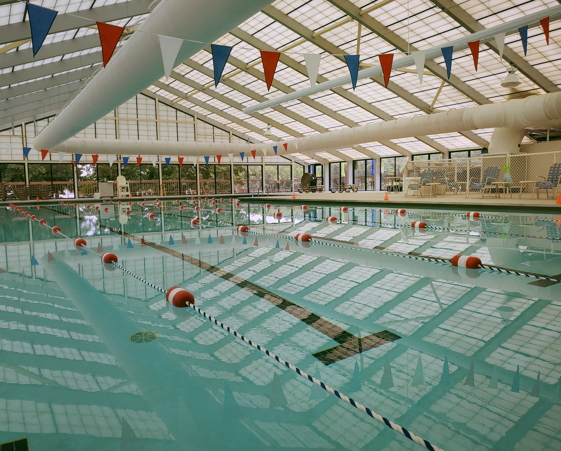 The outdoor pool features 2,900 square feet of water fun. The zero-entry pool has a large open area for play, spray jets, in-water bench seating, and deck diving in the deep end. The deck features a mix of shade and sun options and the building has restrooms and a snack bar.
